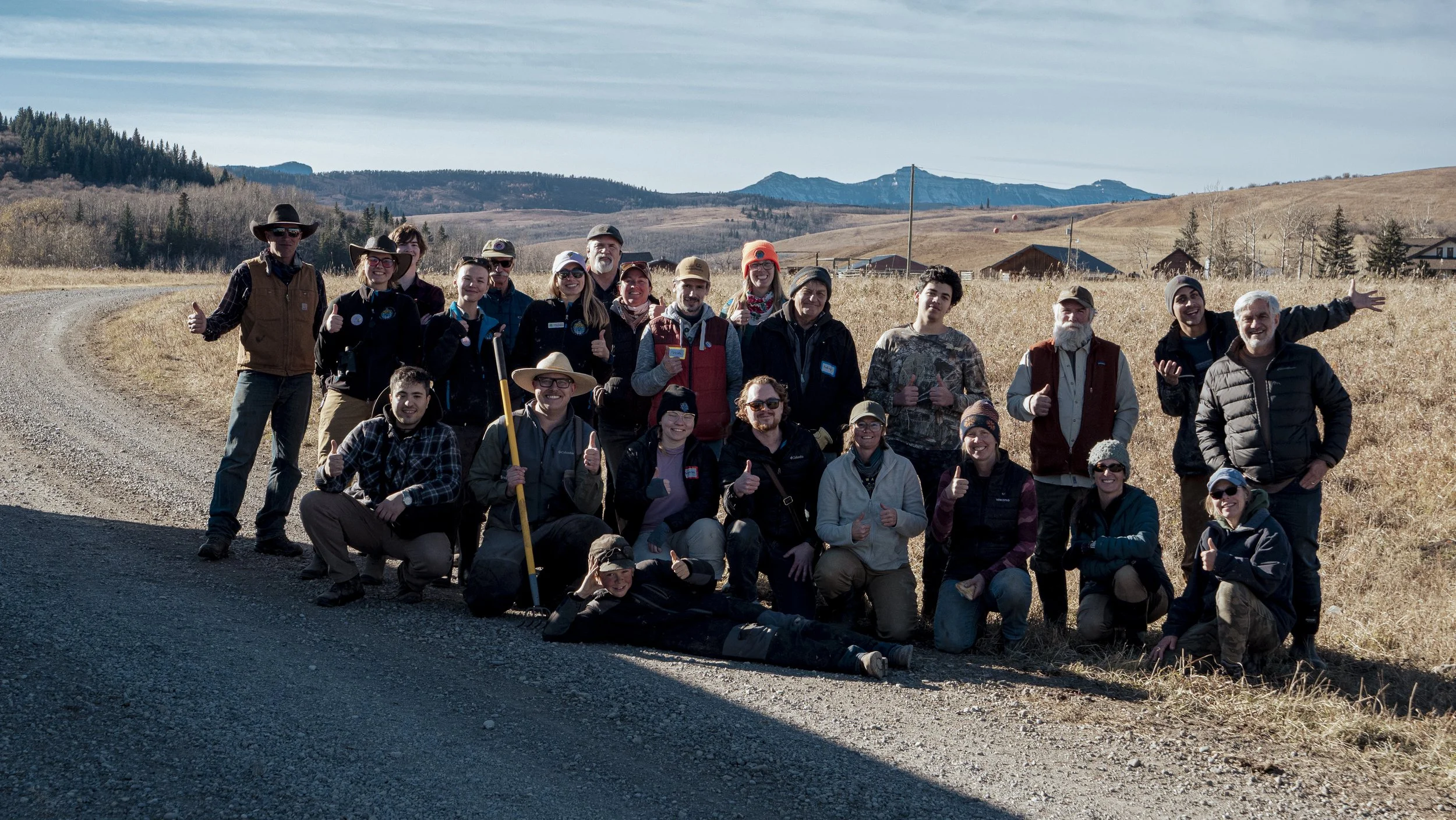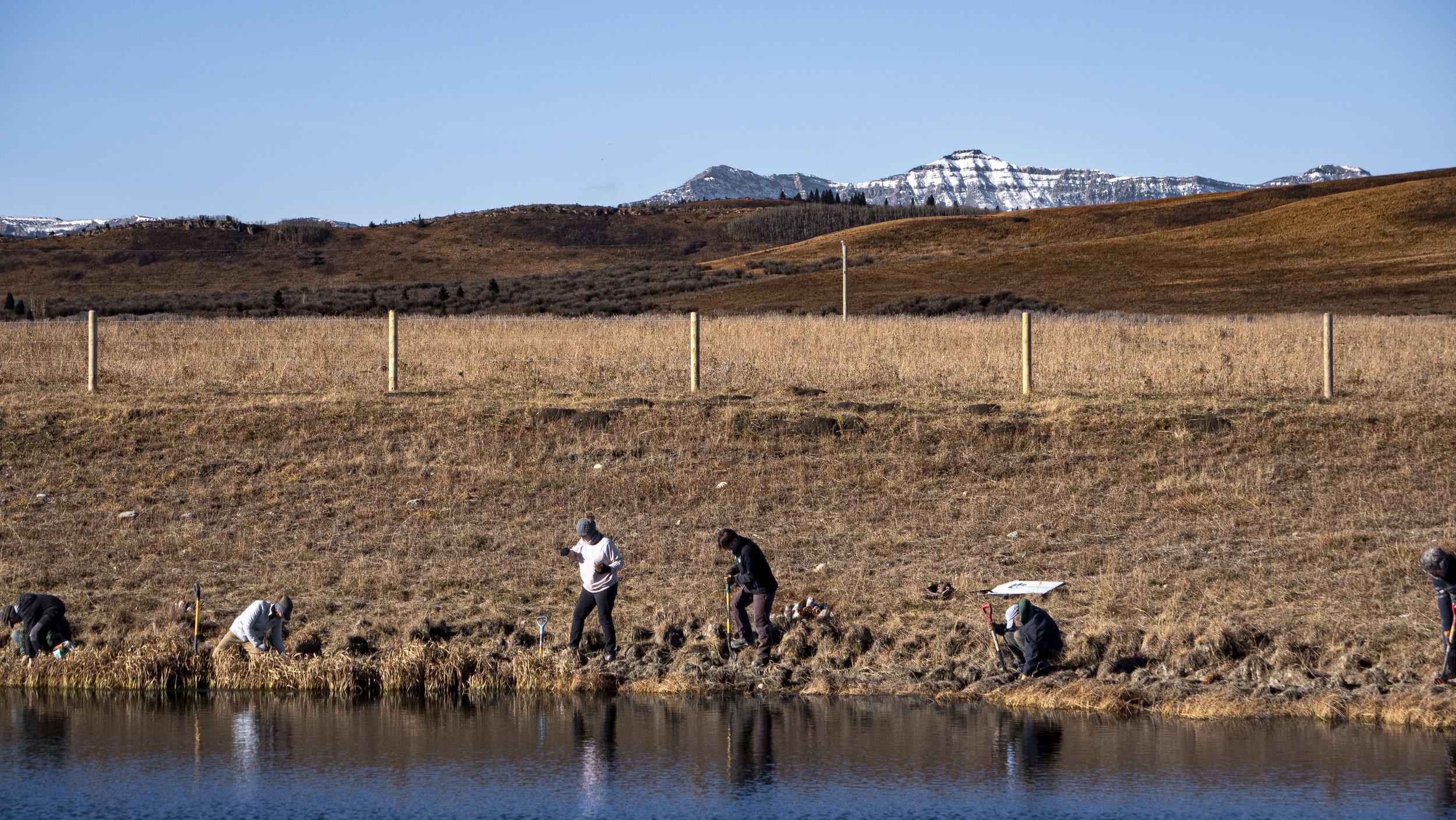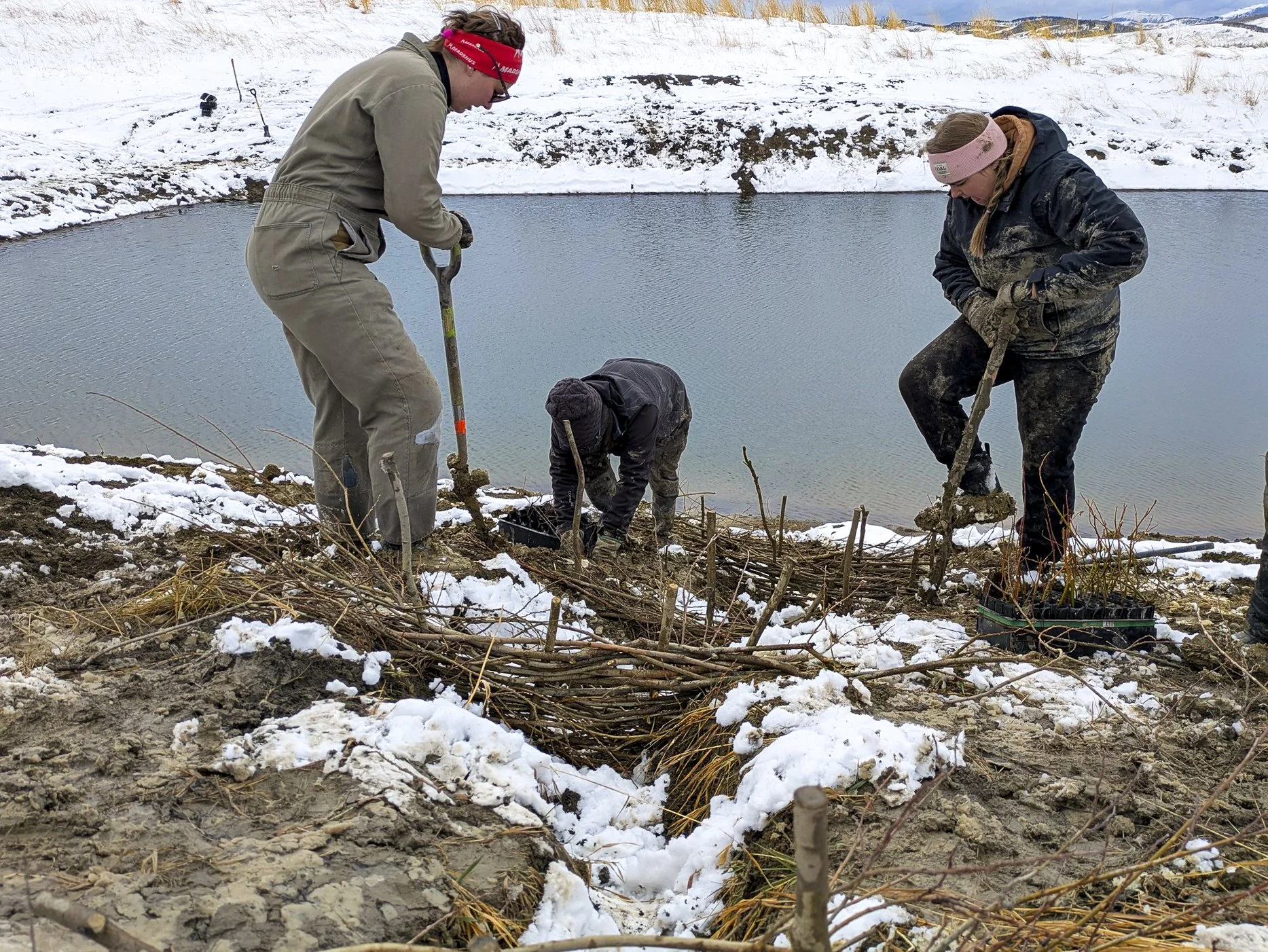 Willow planting at Mt. Sentinel Ranch in April 2025. Willow trees make a big difference for the watershed, and are culturally significant for the Niitsitapi (Blackfoot). Photo by Kallie Val-Zehan/OWC. Learn more in a recent OWC blog post.