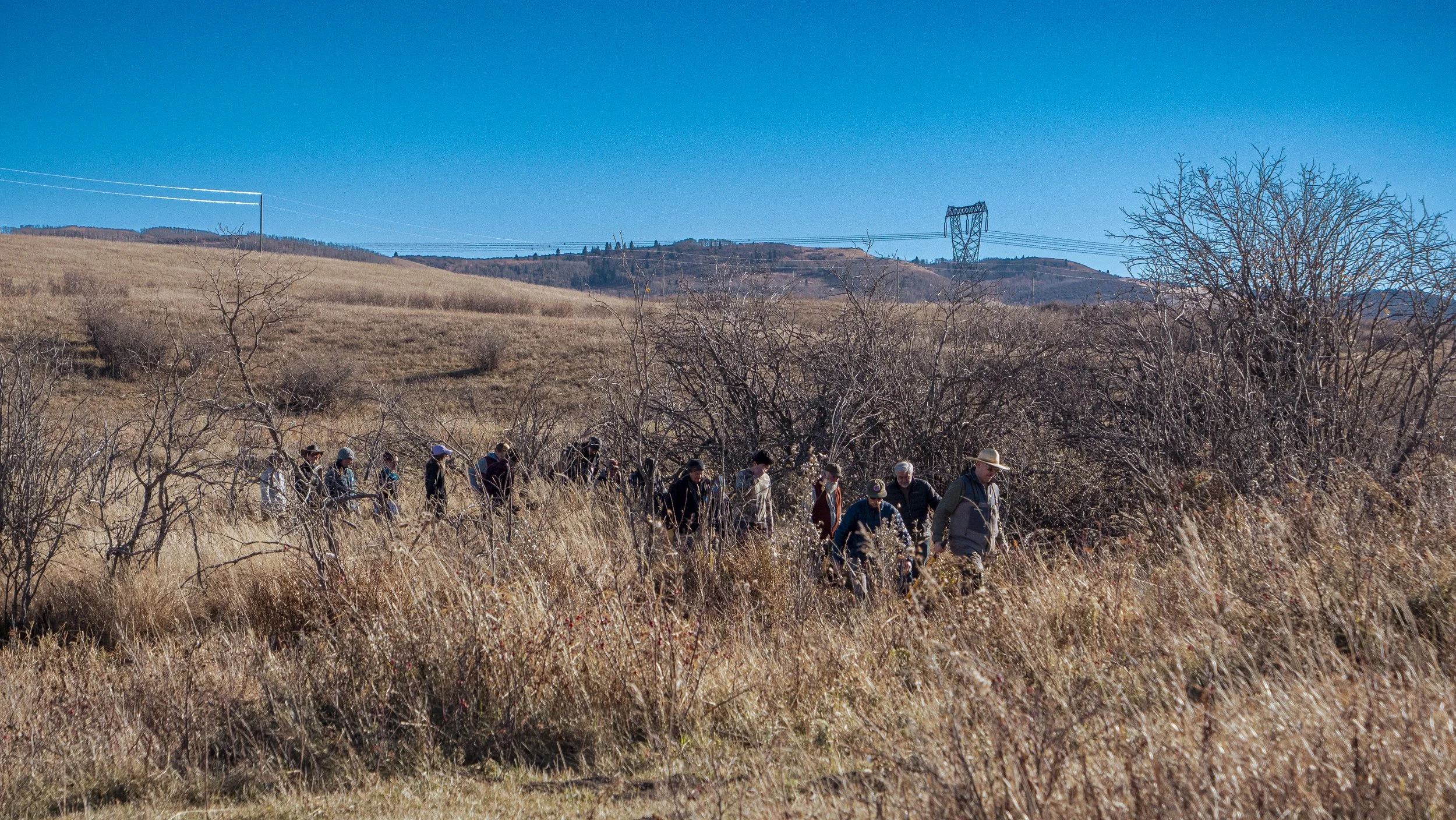 AWE participants tour the property. Rough fescue is a native perennial grass that makes up a major component of fescue grassland ecosystems. It is excellent forage for livestock, especially in the winter: unlike many grasses, the leaves retain protein and nutrient content after the plant is dormant. It is also an important source of forage for wildlife, including mule deer, elk, and bighorn sheep. Photo by Jon Martin/OWC. Learn more about rough fescue here.