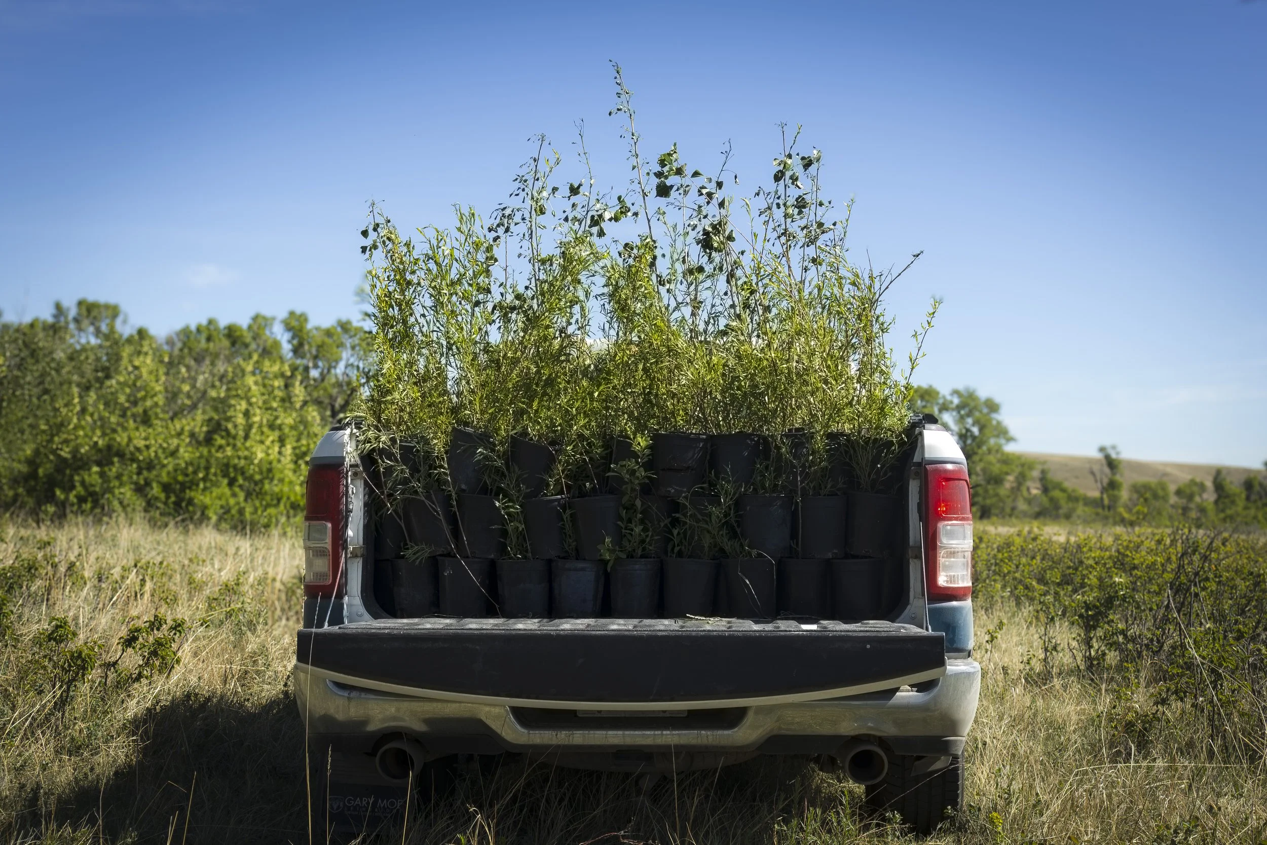 Right in the middle of May’s first summer heat, we drove to Ninna Piiksii’s house on Kainai Nation. Stacked high in the back of the Oldman Watershed Council (OWC) truck were 125 one-gallon pots, each bearing a rooted willow ready to grow on the banks of the Belly River. The backseat was full of shovels and snacks, ready for Ninna Piiksii, Kallie, Deb, and me (Rachel) to spend a hot day planting willows.