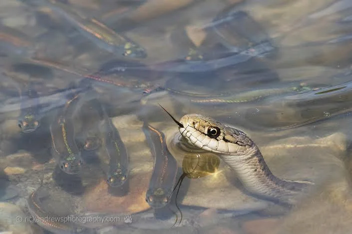 Wandering garter snakes, a subspecies of the western terrestrial garter snake, are very skilled swimmers and hunters, and I watch as they slip silently into the water. In the shallows I can see them darting about, and it doesn’t take long before they return with a fish in their mouths.